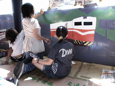 看到一堆小朋友跟台鐵人員在牆壁畫圖~